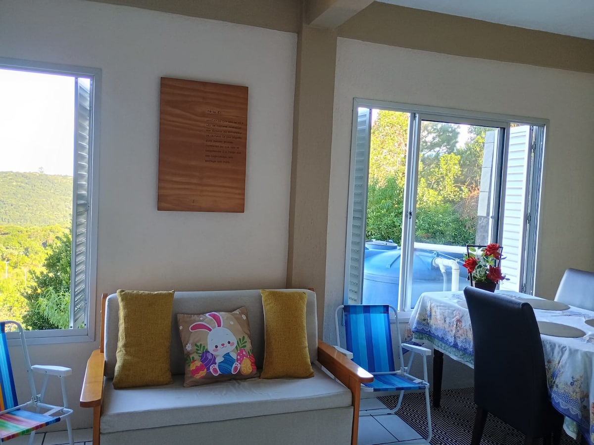 Staðurinn er í 110 m fjarlægð frá miðbæ Gramado í fjölskylduvænu og rólegu hverfi. Það er með einkabaðherbergi, hárþurrku, straujárn, sjónvarp með rásum á staðnum, litlu eldhúsi með ísskáp, örbylgjuofni, kaffivél, tekatli, samlokuvél og öllum áhöldum; það ER ENGIN ELDAVÉL. Komdu myglulausum fyrir og mjög hrein.