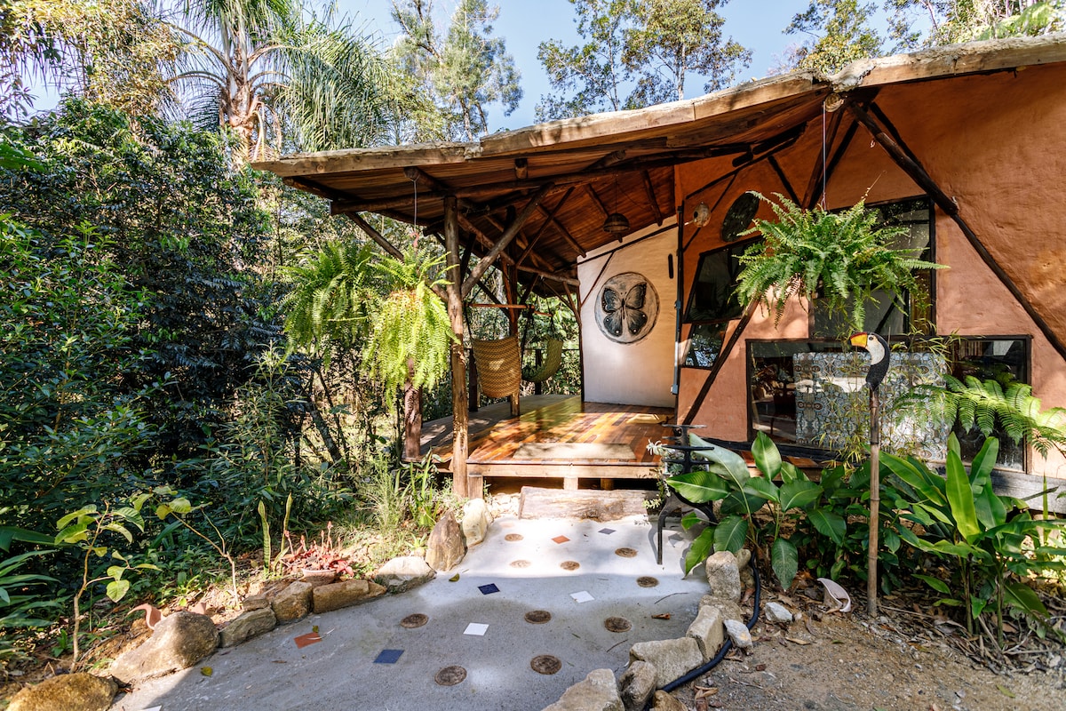 Vistvænn kofi byggður í tækni rammgerðrar jarðar með bambus og leir. Listaverk með miklum stíl og þægindum. Það er á staðnum Borboleta Azul, helgidómur á 40 hektara skógi, sem er með ljúffengan foss með náttúrulegri sundlaug, gönguleiðum og mikilli náttúru til að njóta. Við erum 44 km frá Floripa, 37 km frá Praia da Guarda og 35 km frá Ponta do Papagaio. Í nágrenninu eru góðir veitingastaðir, sushi, brugghús og pizzeria.