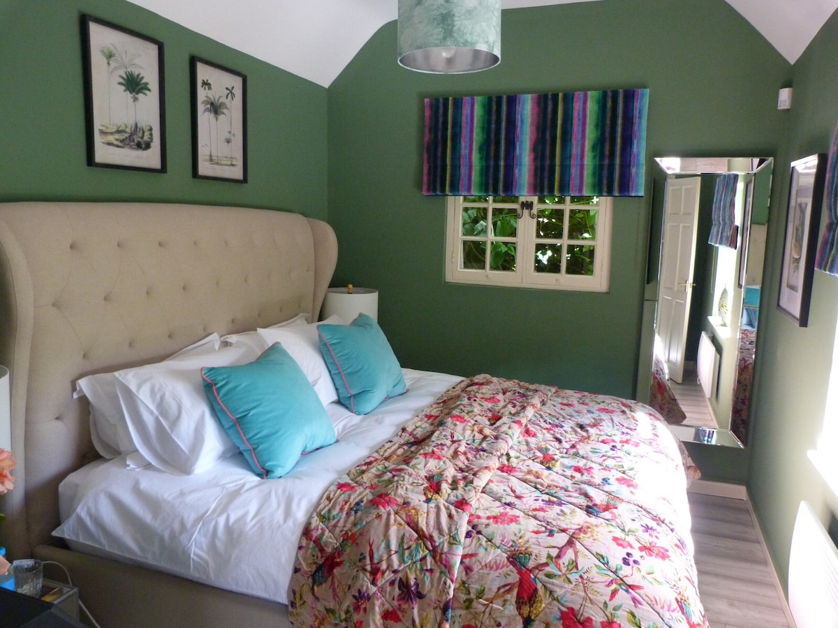 Þetta stúdíó með einu svefnherbergi er einstaklega þægilegt og er með friðsælt og stílhreint andrúmsloft. Það er aðskilið aðalhúsinu svo að þú hafir algjört næði og allt rýmið er þitt til að njóta. Upphitun á gólfi gerir það einstaklega hlýlegt og notalegt, rúmfötin eru vönduð og í fallegum dal þar sem er óvenjulegt magn af söngfuglum og uggum. Það hefur verið hannað með frið og þægindi í huga. Tilvalið að komast í burtu. Ofurhröð rafhleðsla er í 12 mínútna fjarlægð