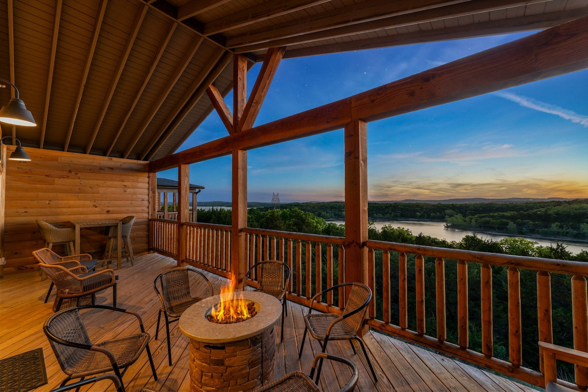 Njóttu glæsilegs ÚTSÝNIS frá öllum sjónarhornum „Falcon's Nest“, nútímalegs kofa við stöðuvatn í Branson! Slakaðu á í kringum sérsniðna veröndina með sjónvarpi og arni, hengirúmum, eldstæði og leikjum utandyra! Skemmtu þér vel í LEIKJAHERBERGINU okkar með spilakössum og klifurvegg, inni- og útisundlaugum OG LÁTLAUSRI Á. Njóttu fegurðar Ozark-fjalla úr opinni stofu með hvelfdu lofti og glugga. Eða njóttu sérstaks kvölds í kringum eldstæðið með útsýni yfir vatnið við Table Rock Lake.