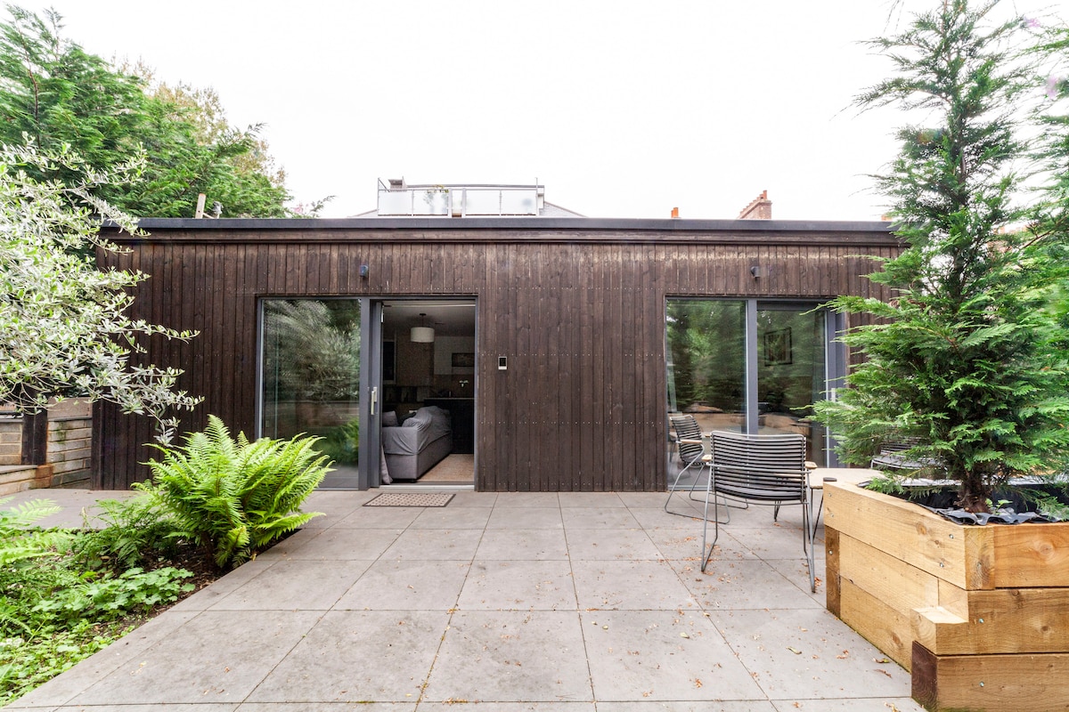 We are a peaceful, modern, minimalistic & carbon zero detached cabin. Very private, very secure, tucked away, surrounded by trees, plants, birds and nature, you'll think you're in the country. It has its own private garden and entrance. The cabin is built from slow-grown larch and has triple glazed doors. Inside is fitted out with sustainable materials like birch ply-panelling and plant based flooring, and we an MVHR clean air system. We harvest rainwater, compost and power by ASHP.