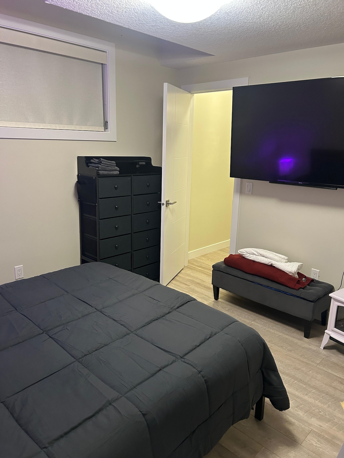 Kick back and relax in this calm, stylish space. It's newly built basement unit with kitchen, bar table and stools, fireplace, couch, one 45 inches tv and. another 65 inches tv, laundry, queen bed. House has everything you will need for your comfort, fully furnished and equipped. right across plaza with food, coffee bar, convenient store, pharmacy, gym, clinic. 3 minutes drive to walmart