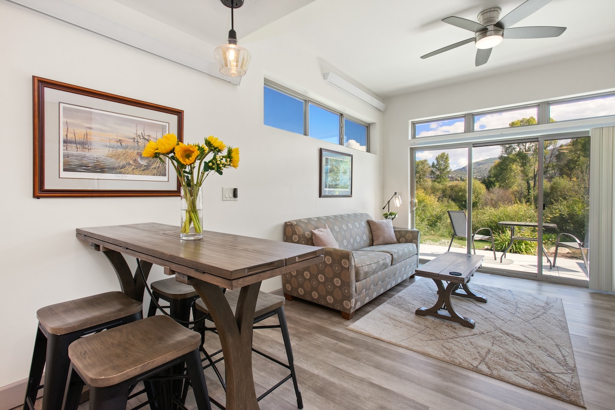 Beautiful 1 bedroom (King), 1.5 bathroom Townhome on Walton Creek. Enjoy this tranquil setting along Walton Creek with amazing views of Mt Werner and surrounding wetlands. This is the perfect place for couples (or small families) with 1 quiet well behaved dog. Townhome includes a well supplied full kitchen, TV, WiFi, queen sofa sleeper & easy parking. The location is close to skiing at Mt Werner, bike path along the Yampa River and is on the bus line for convenience to shops and restaurants.