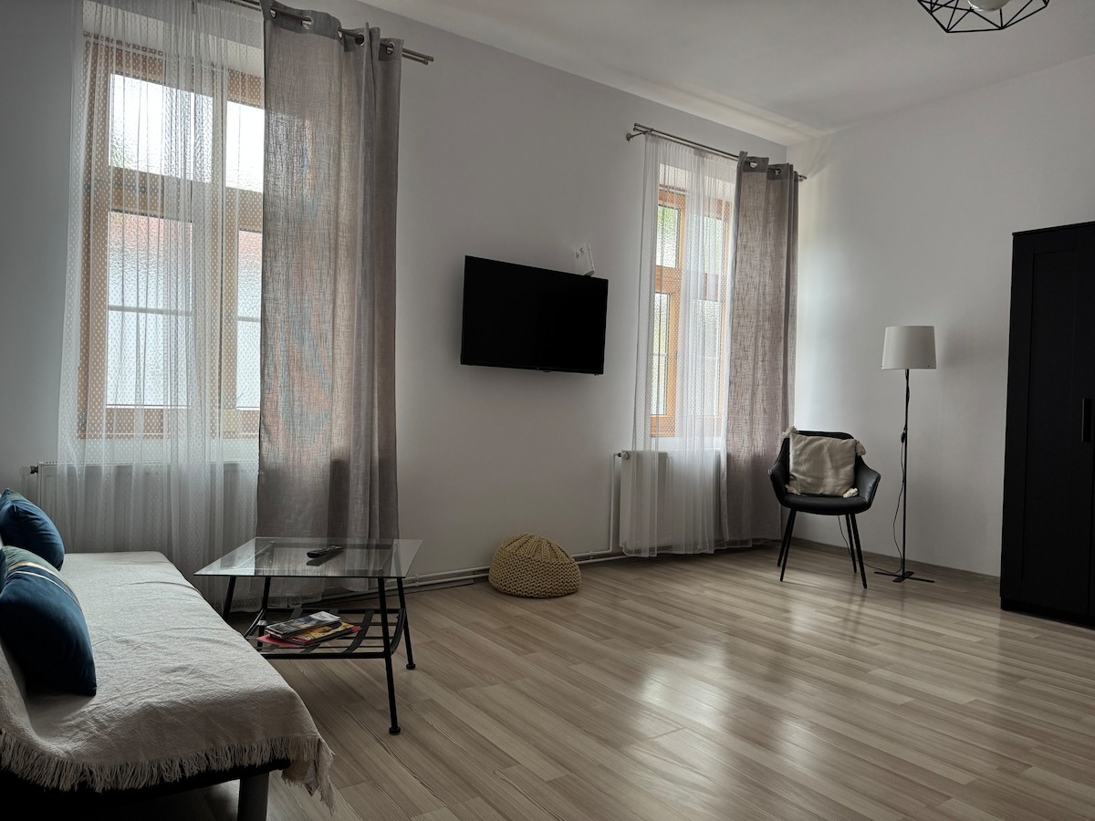 Íbúðin okkar er steinsnar frá Piata Mare (Grand Square) í Sibiu. Það er staðsett í 200 ára gamalli sögulegri byggingu og er með notalegt svefnherbergi, stofu með snjallsjónvarpi (Netflix), hröðu þráðlausu neti og fullbúnu eldhúsi með kaffivél, eldavél og þvottavél. Miðstöðvarhitun heldur öllu heitu á veturna og loftræsting er í boði á sumrin. Lítil einkaverönd eykur sjarma. Fullkominn staður til að slaka á eftir að hafa skoðað borgina í einn dag.