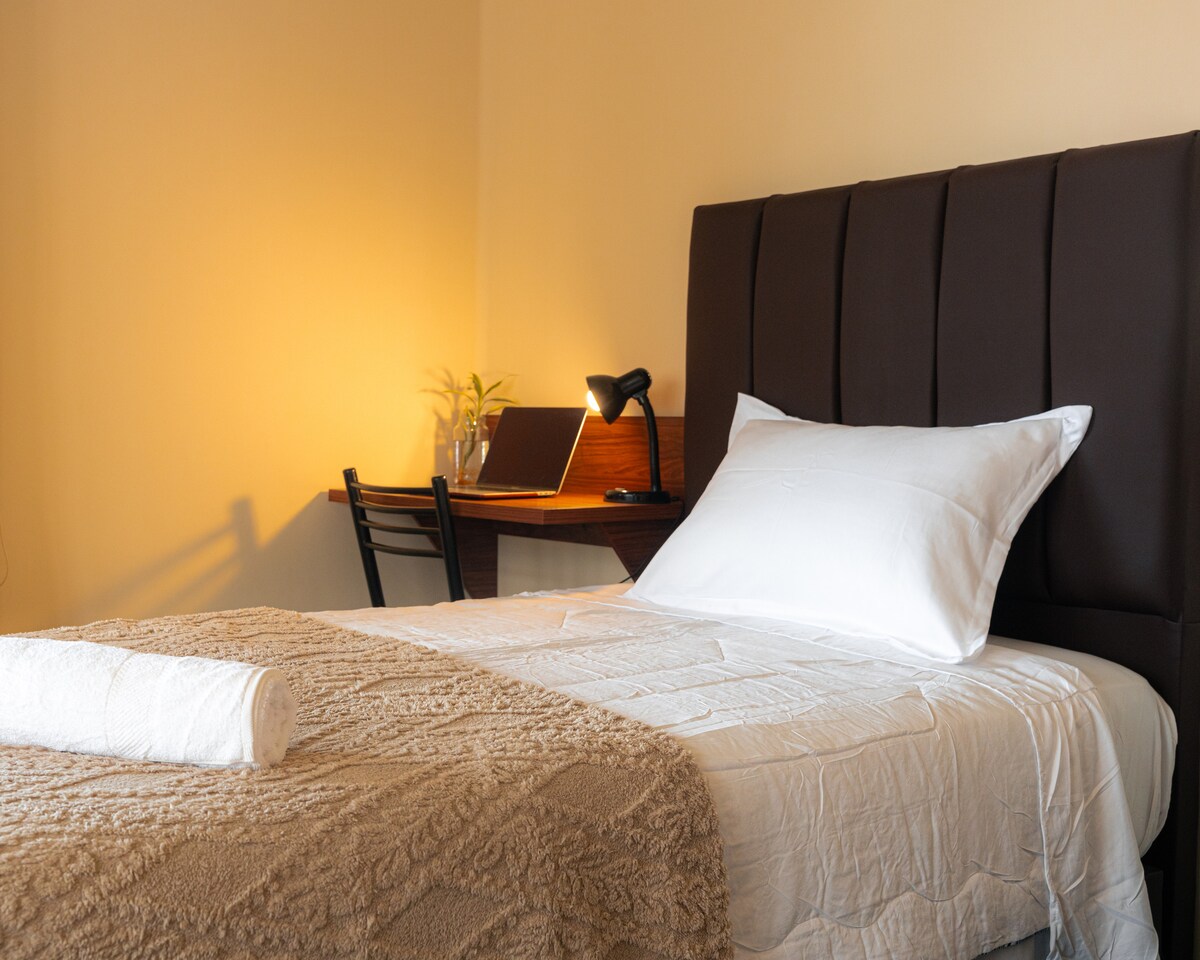 Njóttu þessa rúmgóða, rólega og miðlæga heimilis. Það er staðsett aðeins 4 húsaröðum frá aðaltorginu. Hér er rúmgott svefnherbergi, vinnuaðstaða með háhraðaneti, stofa, sérbaðherbergi og eldhúskrókur. Þetta er rólegur staður, fullur af dagsbirtu. Svæðið er öruggt og mjög hagnýtt: nálægt matvöruverslunum, veitingastöðum og sögulega miðbænum.