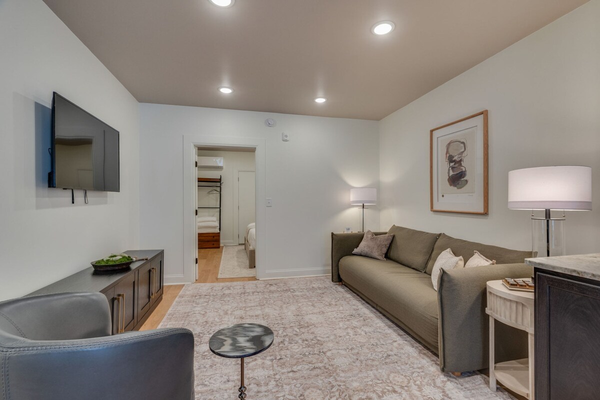 Öll herbergin snúa að suðurhimninum og aflíðandi Blue Ridge fjöllunum. Herbergin okkar með king-size rúmi og svefnsófa rúma allt að 3 manns og eru með þægilegt king-size rúm, notalegan setkrók með svefnsófa og sérbaðherbergi með sturtu sem hægt er að stíga beint inn í. Öll herbergin eru með snjallsjónvarp, Bluetooth-skynjara/hátalara, öryggishólf fyrir fartölvu og lítinn ísskáp. Búast má við fágaðri veituþjónustu og snjallri hönnun. Þessi herbergistegund er um 340 fermetrar að stærð.