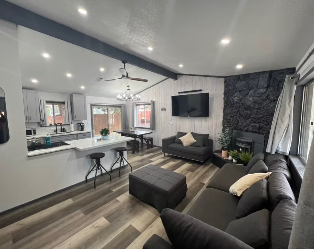 Indulge in the tranquility of Big Bear Lake at our impeccably designed 2-bed, 1-bath home. Featuring tasteful interiors, a spacious yard for pets, and a fully equipped kitchen including a Vitamix blender, every detail caters to comfort and convenience. Nestled within walking distance to the lake, and also a quick, easy drive to hiking trails, this home will ensure an unforgettable mountain escape for outdoor enthusiasts. We have a travel crib and high chair for little ones.