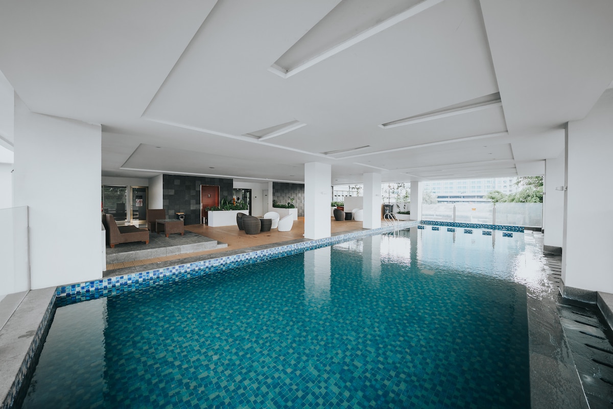 Íbúðin okkar er staðsett í miðri Bandung-borg og þar eru 2 stórar verslunarmiðstöðvar, BIP Mall og Bec Mall, sem er mjög auðvelt að komast í göngufæri. Þú munt njóta sólseturs Bandung-borgar í hæð 21. hæðar Ókeypis hratt þráðlaust net með 55 tommu 4K snjallsjónvarpi með úrvalsaðild að Netflix, Disney+, HBO Max, IQIYI, Viu Þú sefur á King Size, King Koil dýnu og 2 auka gólfmottum Vinsamlegast hafðu í huga að bílastæði - bæði fyrir mótorhjól og bíla - eru aðeins peningalaus