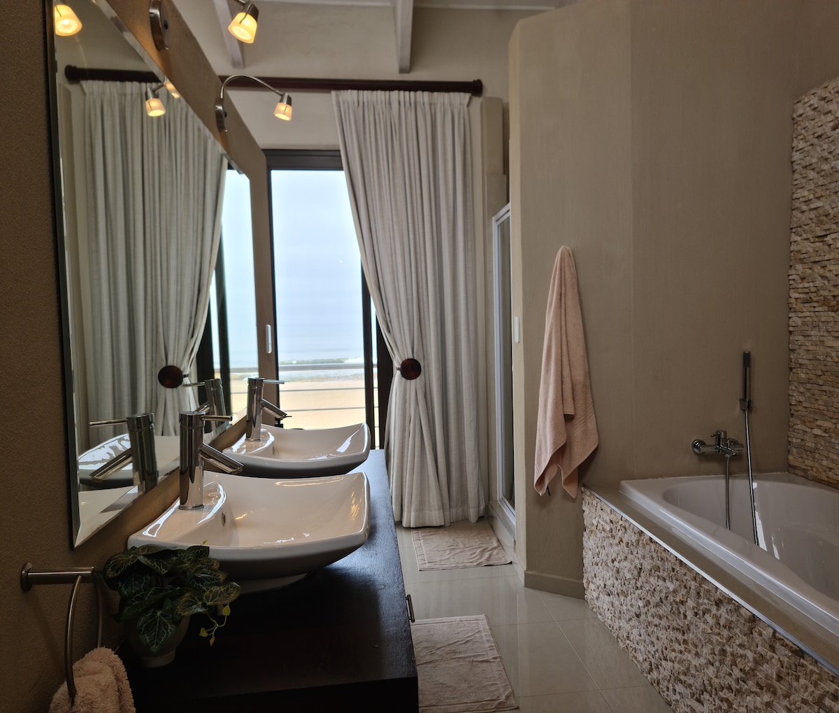 Self-catering studio with private bathroom. Separate entrance. Access to pool. 20 meters from beach. Main house is beach front. 15 Kilometers from Swakopmund and 15 kilometers from Walvis Bay. Beautiful seafront property hosting two separate self-catering rooms. Rooms not combined.