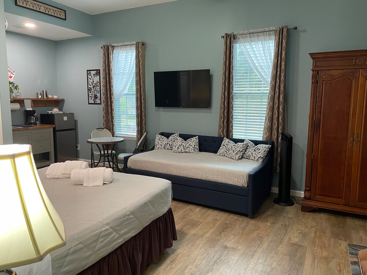 Great for Couples, Business Travelers, Tourist Traveling, Solo Adventurers, Relocating, Longer Stays. This is a DOWNSTAIRS studio is in an Older Neighborhood. You will see some homes that are renovated and some homes that are not. Equipped with: ✔️Self Check In via Lockbox ➢ Queen bed with pillow top ➢ Comfortably accommodates up to two people. Fully functional kitchen with pots, pans, dishes, stove, fridge. ➢ High-speed WIFI ➢ Smart TV to access your Netflix and Amazon Prime accounts