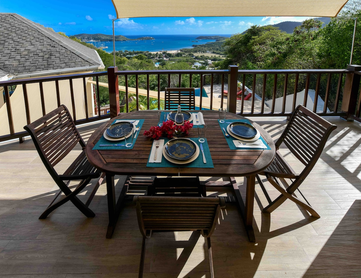 COVID 19 APPROVED Renovated Studio in quiet area, secluded, very private, but close to the action. Very breezy. Open plan kitchen, living, dining and bedroom, bathroom with walk in rain shower. Kitchen has solid concrete counter tops, new stove and large fridge plus all amenities, large ceiling fan. Private outside deck/living room with great view of the Marinas and Falmouth. Situated at Cobbs Cross within walking distance of English Harbour and the Marinas. Suitable for 1 or 2 people.