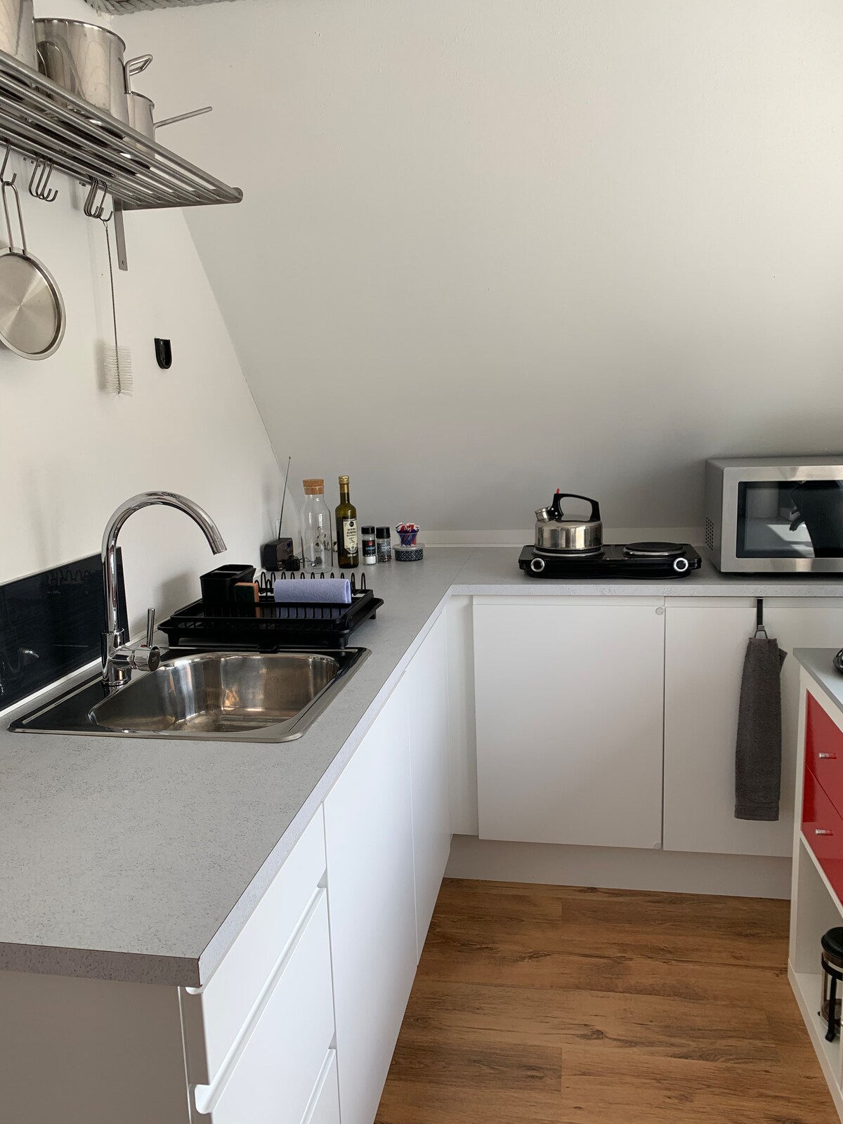 Íbúðin er björt, notaleg og mjög lítil (um 34m2, 1,5 herbergi) og var síðast endurnýjuð í janúar 2022. Innbyggt eldhús, vistvæn hönnun á gólfi (án orða) og rafmagn var endurnýjað árið 2017. Hentar öllum sem vilja vera við jaðar Westerland og hafa ekkert á móti „sjarma gulrar brinker-fléttu“ Theodor Heuss Str. 16-22“. Litlar suðvestursvalir í boði. Bílastæði. Koma þarf með rúmföt/handklæði/diskaþurrkur gegn aukagjaldi sem nemur 20 evrum á mann.