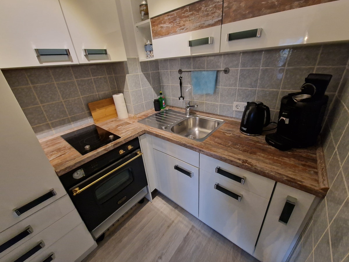 Notalega, mjög bjarta íbúðin okkar á jarðhæð, u.þ.b. 70 m², með einstæðiseinkennum býður þér upp á u.þ.b. 40 m² stofu/borðstofu með opnu eldhúsi, borðstofu og arineldsstæði, skrifstofu, sturtuherbergi með sturtu, sérstakt svefnherbergi, stóra, yfirbyggða verönd með gufubaði og nuddpotti og yfirvaxinn garð. Ströndin, miðborgin og lestarstöðin eru í göngufæri á um 10-15 mínútum, næsti matvöruverslun í næsta nágrenni. Hundar eru velkomnir hér!