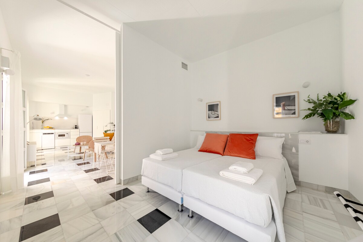 This luxurious apartment is located in the heart of Seville, facing the three UNESCO World Heritage monuments: the Cathedral, the Giralda, the Archivo de Indias, and the Royal Alcázars. With a modern design, it features 1 bedroom, 1 bathroom, a living room with a Smart TV, and a fully equipped kitchen with high-end appliances, including a toaster, blender, oven, kettle, and Nespresso coffee maker. Additionally, it has a private terrace with stunning views of the city's main monuments.