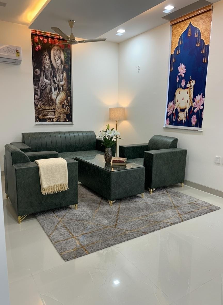 Íbúðin okkar er hönnuð til að sökkva þér í guðdómlegt andrúmsloft Vrindavan með úthugsuðum listaverkum frá Radha-Krishna og kyrrlátum smáatriðum. Svalirnar eru friðsæll staður sem er fullkominn fyrir afslöppun. Upplifðu lúxus í Vrindavan! Þessi íbúð er í nokkurra mínútna fjarlægð frá Prem Mandir, ISKCON-hofinu og Banke Bihari og býður upp á gríðarlegan frið með nútímaþægindum. Njóttu sjálfsinnritunar, háhraða þráðlauss nets, fullbúins eldhúss, snyrtivara og góðs umsjónarmanns sem mælir með staðnum.