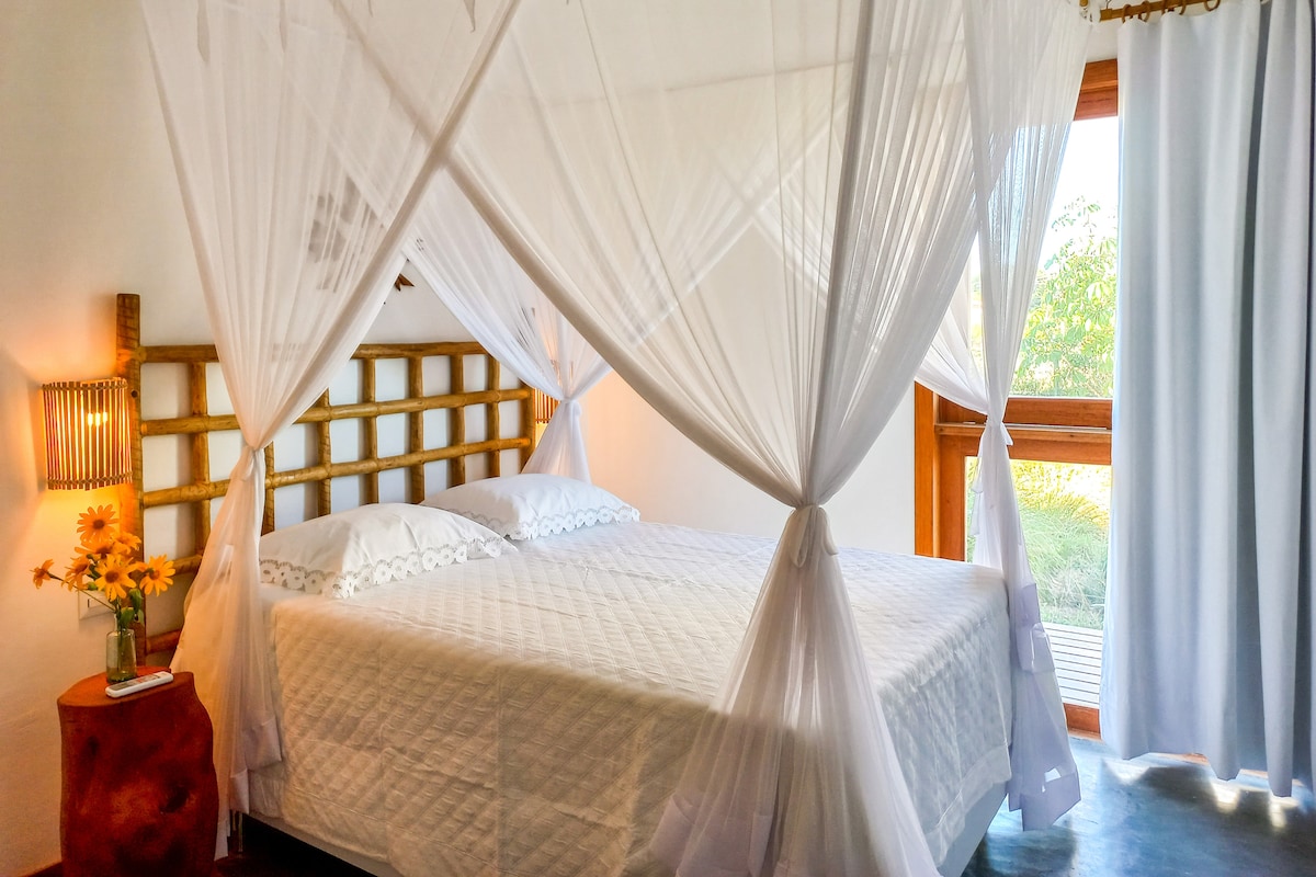 Þorpshæð með svölum í afgirtu samfélagi sem samanstendur af 02 svítum, 01 svefnherbergi og gestabaðherbergi, eldhúsi, stofu og svölum. Rétt við sandinn með einkaaðgangi að ströndinni og besta sólsetrinu í Barra Grande. Kyrrlátt og notalegt umhverfi. Við erum með 02 internets, 01 frá fyrirtæki á staðnum og 01 í gegnum Starlink gervitungl til vara. Rúmar 6 fullorðna og 2 börn upp að 12 ára aldri.