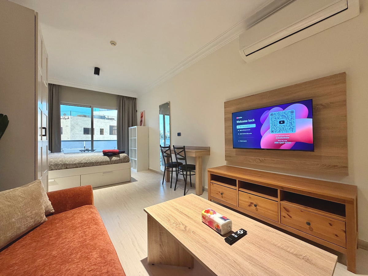 Upplifðu töfrandi borgarútsýni í nýja stúdíóinu okkar á þakinu í Dair Ghbar, fínasta hverfi Amman. Ótrúlegt útisvæði sem býður upp á fullkominn hugarró, innifelur fullbúið eldhús og útigrill. Ótrúleg þægindi: Risastórt 58" snjallsjónvarp með Netflix, YouTube og speglun Háhraða trefjar Internet Þægilegt svefnsófi fyrir aukagesti Íbúðin er í 2 mínútna fjarlægð frá bandaríska sendiráðinu, Taj-verslunarmiðstöðinni og öðrum líflegum stöðum á borð við Sweifieh og Abdoun.
