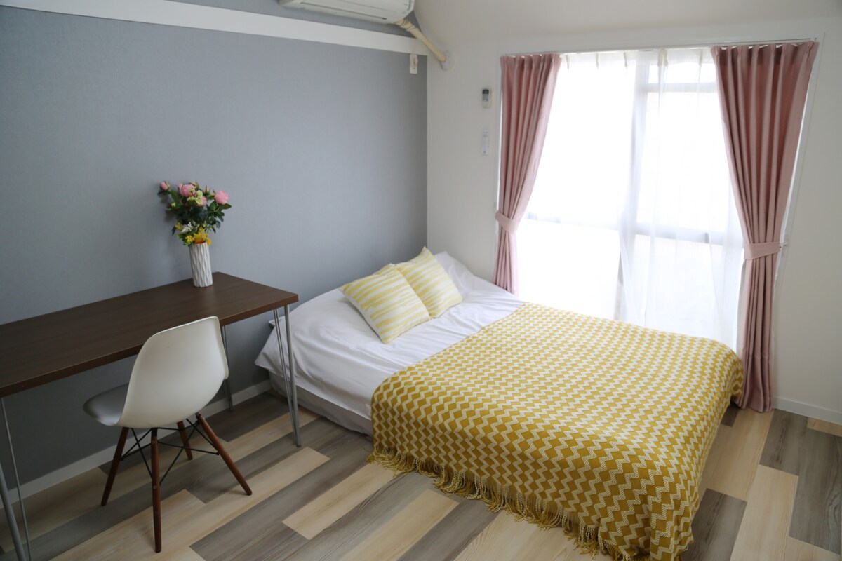 Studio Apt, located in the Higashi-Shinjuku and Shin-Okubo area, suitable for solo traveler or couples. The open space features a double bed, a dining table and chairs. The kitchen is equipped with a two-burner IH stove, microwave, and other cooking essentials. The bathroom and toilet are separated, with the bathroom including a dressing area and a bathtub. A rear balcony is available for laundry and drying clothes.