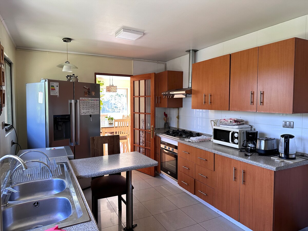 Rúmgóð og vel upplýst rými, HD kapalsjónvarp, þráðlaust net, djúphældarbrunnur, vel búið eldhús, vatnstunnur með hreinsuðu vatni, sundlaug, verönd, grillsvæði. Nálægt sjúkrahúsinu, 10 mínútur frá borgarmiðstöðvum, matvöruverslunum, verslunarmiðstöð, nálægt Viña Undurraga, viðburðamiðstöðvum og ýmsum veitingastöðum. 25 mínútur frá vínekrunni Isla de Maipo og ýmsum ferðamannastöðum, fjallinu, Pomaire o.s.frv.