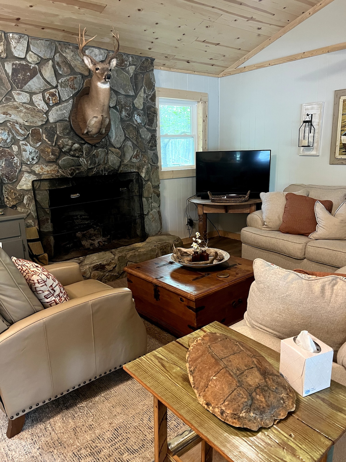 Welcome to The Creekside Burrow, my custom designed guest house in nature. Every detail has been designed for your enjoyment and awe—live edge red oak headboard made from locally sourced trees, rain shower head with twinkling lights, tree-house style kitchen, and a private porch with firepit right outside the front door. Situated on a peaceful little creek, you can fall asleep to the sound of gently rushing water. New AC/heat for your comfort. Fast WiFi. 65” backlit Smart TV. And more!