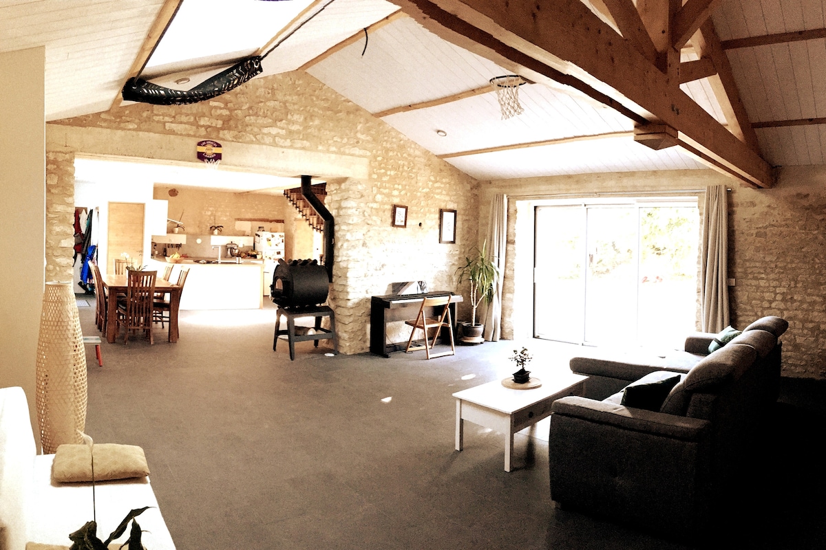La Petite Foiserie er í sveitinni og er í 10 mínútna fjarlægð frá Les Sables d 'Olonne. Stór sundlaug sem er 12 mx6m (upphituð frá 15. maí til 15. september) sem er deilt með eigandanum, garður sem er 3300m2. Bústaður sem er 160 m2 að stærð og samanstendur af stórri stofu með viðareldavél, fullbúnu opnu eldhúsi, 3 svefnherbergjum, baðherbergi með sturtu, 2 vöskum og salerni. Stór viðarverönd. Lök, handklæði og þrif eru valfrjáls.