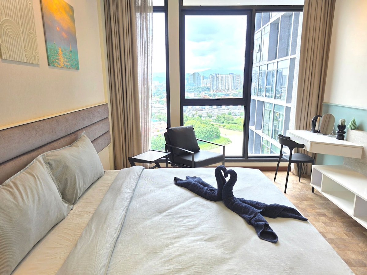 您好, 我们也说中文! Welcome to our charming 1-bedroom flat in Bukit Bintang, KL most vibrant and heritage-rich area. Step out onto the balcony and enjoy an unblocked, breathtaking view of the iconic Merdeka 118 Tower rising majestically above the city skyline, a truly memorable sight both day and night. Inside, you’ll find a king bed, a fully equipped kitchen, and a living area designed for comfort and relaxation to make our flat offers the perfect home base to experience the best of Kuala Lumpur.