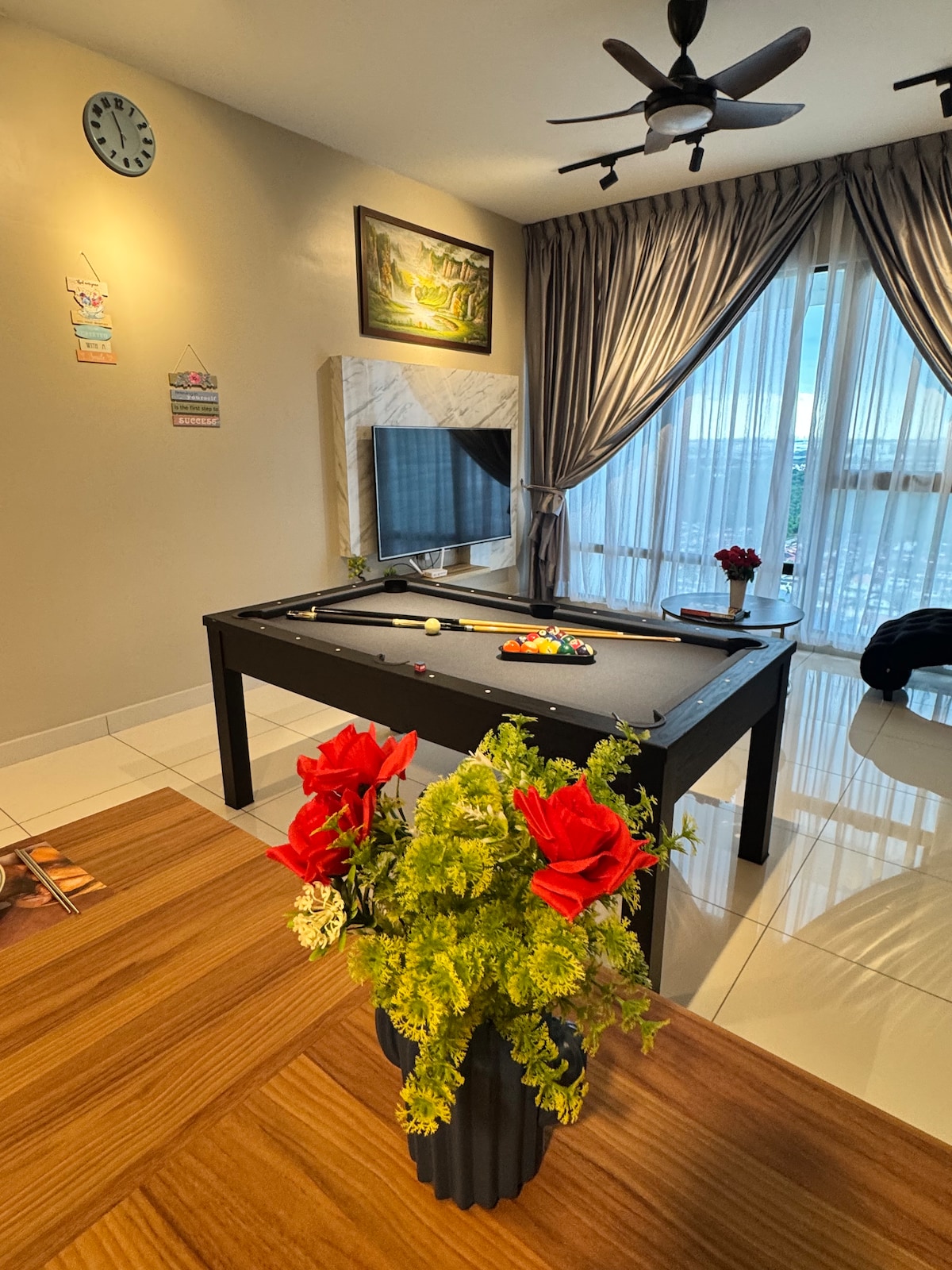 Cozy and Beautiful, Mini Pool Table in House, WIFI-enabled condominium with Gym and Infinity Pool in Johor Bahru. The Mall, Southkey Midvalley Mall - 5 Mins WALKING DISTANCE. 65” Smart TV 4K With NETFLIX/ YOUTUBE WIFI 500 Mbs.✅ KSL -10 Min CIQ-10 Min Larkin-20mins Danga bay -18mins Paradigm Mall-20 to 25mins -Light cooking allowed( Salt and oil provided) -Washing Machine -Extra Mattress Queen size available with Pillows and Blankets- Total Rm 50(👈🏼 Just for Laundry cost😊
