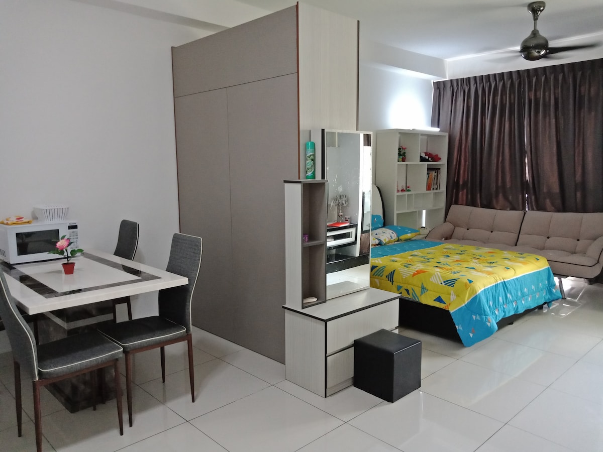 Ótrúleg staðsetning í hjarta Johor Bahru. Þetta er óneitanlega fyrsti og besti kosturinn fyrir dvöl þína í Johor Bahru. Flott, notaleg stúdíóíbúð með aðstöðu á hóteli. Himnaríki matarlistarinnar, næturlífsskemmtun og fjölmargar verslunarmiðstöðvar eru út um allt í nágrenninu. Innifalið þráðlaust net, hrein handklæði, útbúinn eldhúskrókur, þvottavél, öryggi allan sólarhringinn, frábær staðsetning! Frábært fyrir pör, staka ævintýraferðamenn og viðskiptaferðamenn.