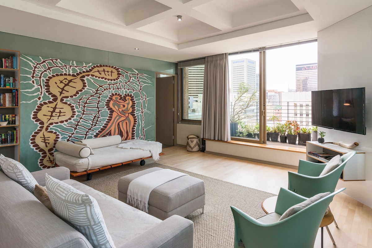 Finndu rými til að hlaða batteríin í sögufrægu, minimalísku hönnunarheimili. Endurnærðu skilningarvitin í fagurlega rólegu rými með eintónaþema, blöndu af nútímalegu og sígildu yfirbragði, upprunalegri list og fjallaútsýni. Háleitur arkitektúr hússins gerir þetta rými einstakt og einstaklega notalegt að lifa. Svæðið er mjög öruggt og fullt af frábærum veitingastöðum og börum. Torgið er einn fallegasti miðbærinn og hann er á arfleifðarsvæði. Húsið er einnig mjög öruggt, með viðvörun, örugg hlið o.fl. Gestir mega reykja á veröndinni en ekki inni í risinu. Gestir hafa séraðgang að öllum svæðum aðalhússins Ég bý ekki í eigninni en er til taks þegar þörf krefur Svæðið er mest miðsvæðis í öllum Höfðaborg, mitt á milli mjög hippalegra og sögulegra staða. Í hverfinu er fjöldi veitingastaða, kaffihúsa og verslana. Torgið fyrir framan húsið er með nægum ókeypis almenningsbílastæði fyrir bíla. Uber er fljótlegasta, þægilegasta og hagkvæmasta leiðin til að komast um. Næsta hopp á, hop off strætó hættir er 150m frá húsinu. Fyrir almenningssamgöngur er næsta MyCity strætó hættir 400m frá húsinu. Þrif og þvottaþjónusta er í boði eftir samkomulagi Svæðið er mest miðsvæðis í öllum Höfðaborg og þar er að finna mjög hipp og sögufræga staði. Í hverfinu er fjöldi veitingastaða, kaffihúsa og verslana.