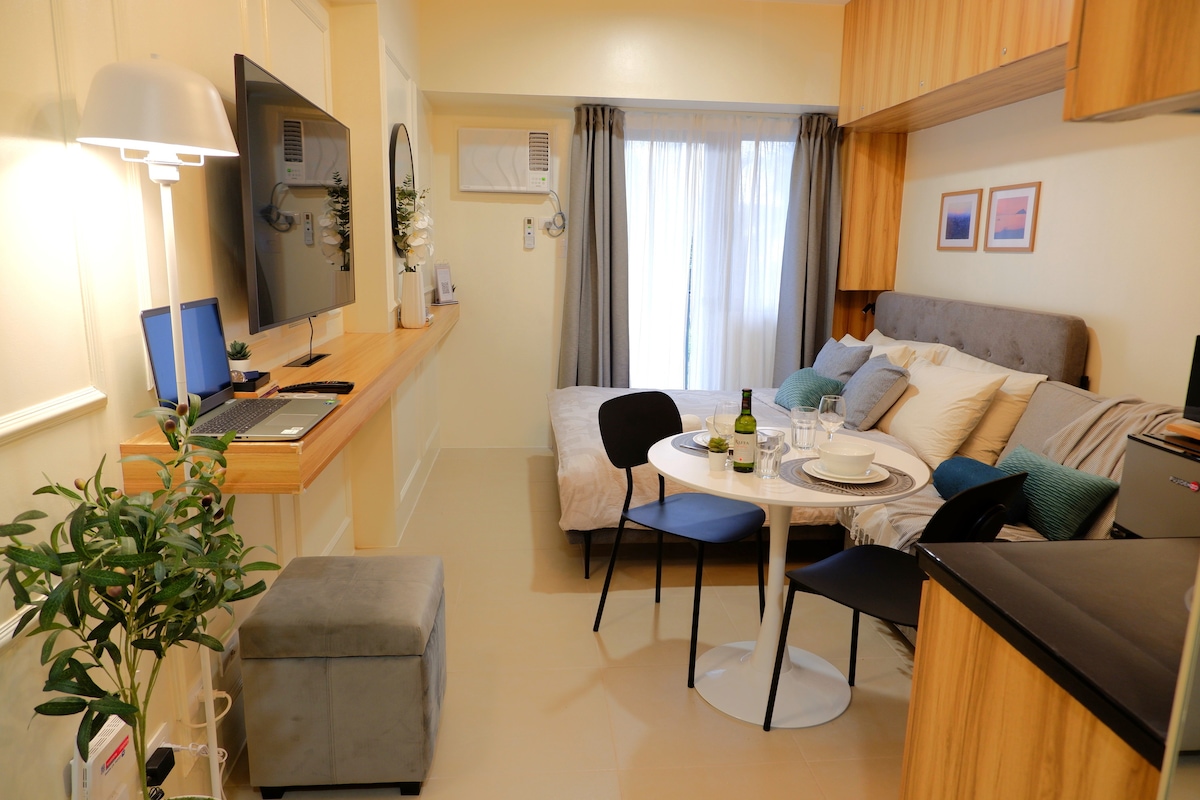 Yndislegur staður til að slaka á og slaka á eftir annasaman dag í vinnunni. Njóttu þæginda og kyrrðar þessarar nútímalegu íbúðar með 1 svefnherbergi. Íbúðin er með einlitu litasamsetningu með hertu gleri og viðaryfirborðum. Njóttu Netflix í þægilegum sófa eða eyddu tíma á svölunum til að njóta svalrar golunnar og notalegs veðurs í Tagaytay. Þú getur einnig eytt tíma í að dást að yfirgripsmiklu útsýni yfir Taal-vatn í Sky Lounge sem gestir hafa aðgang að.