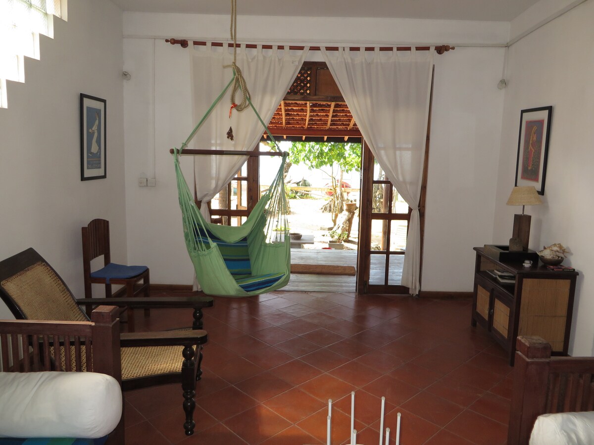 Strandhús í eigu Evrópu í afskekktum flóa í Thalaramba, í nokkurra mínútna fjarlægð frá líflegu Mirissa og býður upp á glæsilega gistiaðstöðu. Fullkomið fyrir par í aðalsvefnherberginu og nýuppgerða svefnherberginu er með tvö einbreið rúm fyrir 2 börn eða 2 fullorðna einstaklinga. Með smekklegum innréttingum í nýlendustíl Srí Lanka með aðskilinni stofu og vel búnu eldhúsi. Þráðlaus nettenging með 100 mbps fyrir þá sem vinna sem stafrænir hirðingjar. Það er EKKI loftkæling en það eru viftur.