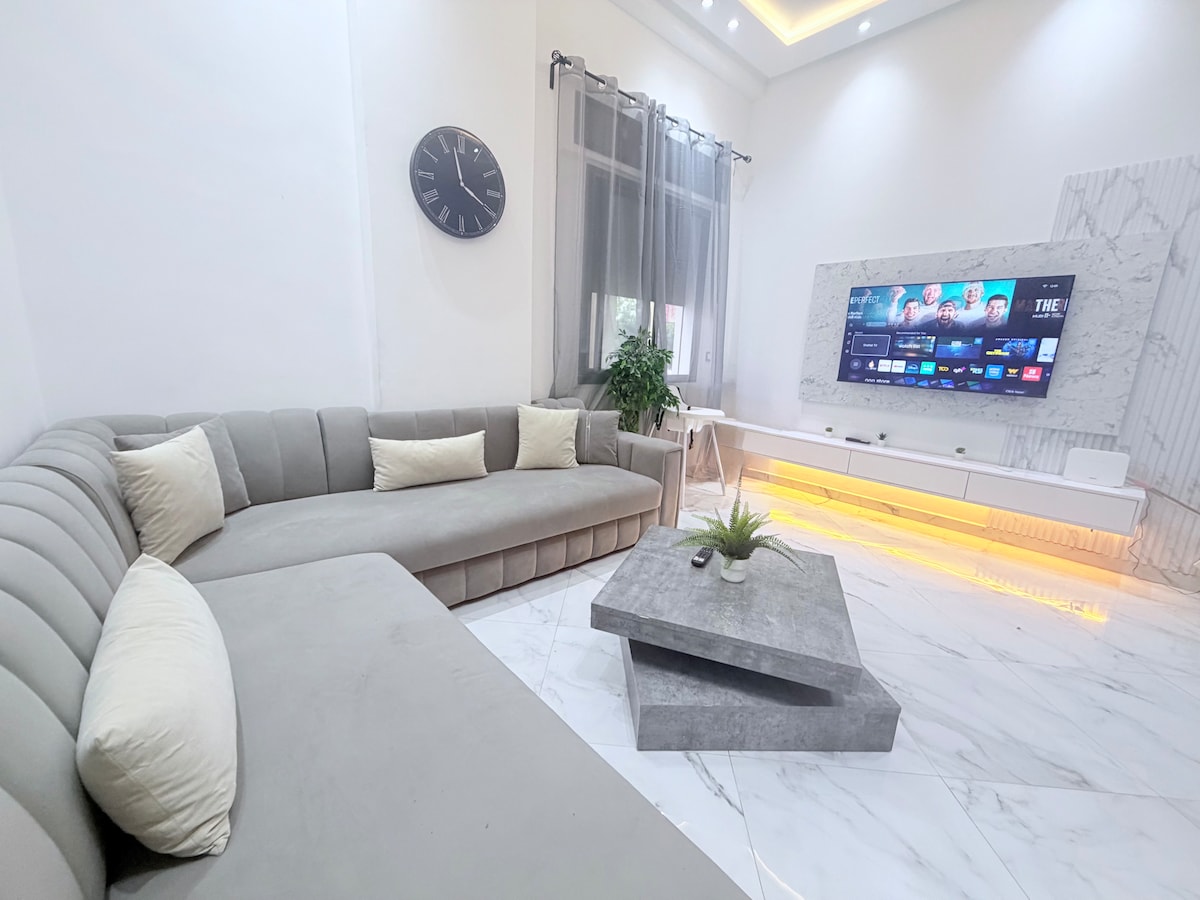 Verið velkomin í glænýju tveggja svefnherbergja íbúðina okkar á forréttinda svæði í Tangier. ( Enface Royale tulip) Þessi hágæða eign er staðsett á einu eftirsóttasta svæði borgarinnar með sólarhringsþjónustu/ öryggisgæslu og í aðeins 2 mínútna göngufjarlægð frá lestarstöðinni, verslunarmiðstöðinni í miðbænum, verslunarmiðstöðinni í miðborginni og fallegum ströndum. Það býður upp á bæði þægindi og lúxus fyrir framan höfnina þína