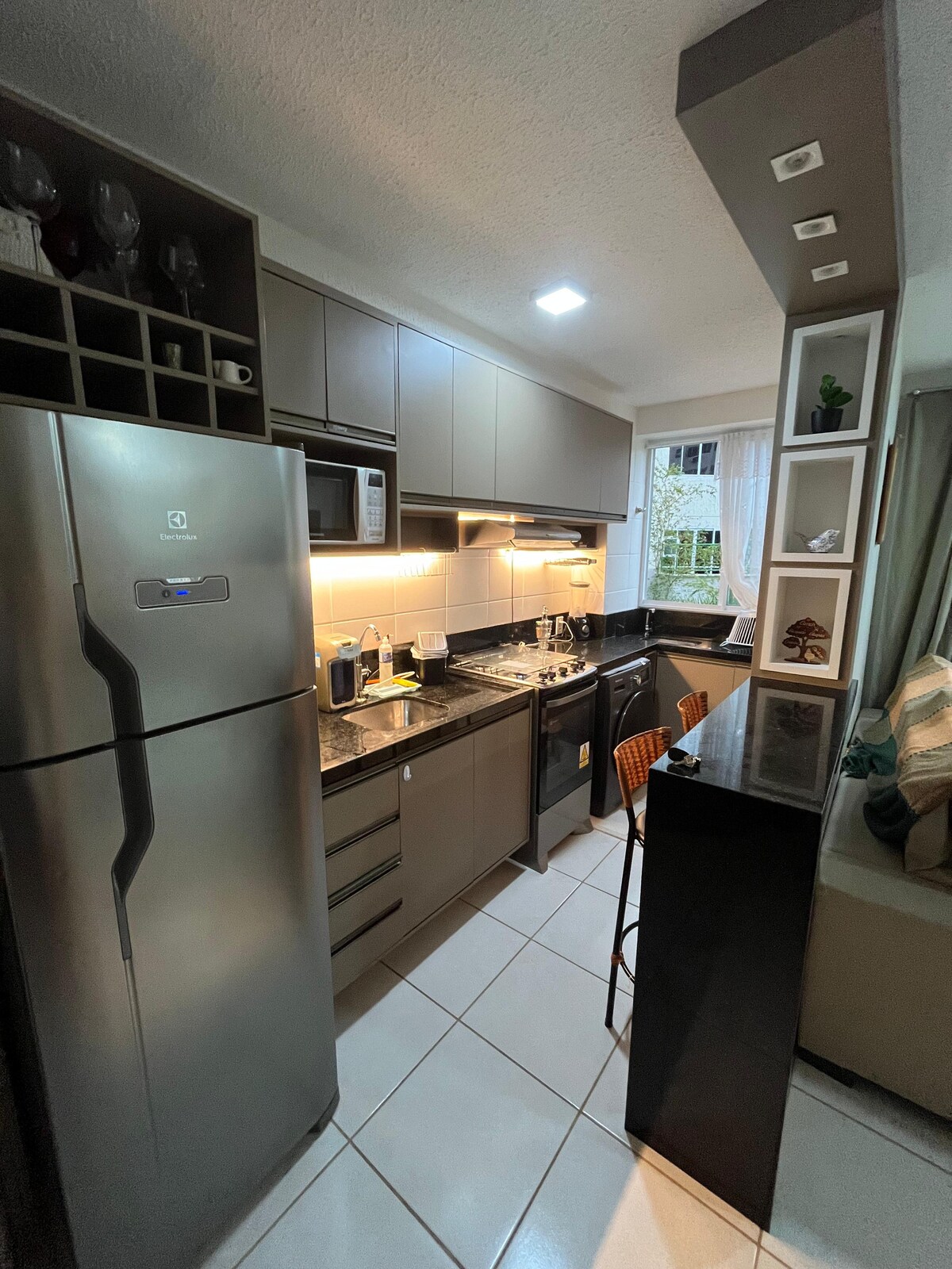 Njóttu þessarar hljóðlátu íbúðar. Aconchegante og hagnýtt, tilvalið fyrir fjarvinnu og fjölskylduhvíld! Það er með hratt net, skrifborð, king-size rúm, loftkælingu, sjónvarp með Netflix og Prime Video. Herbergi með svefnsófa, fullbúnu eldhúsi (eldavél, ísskáp, þvottavél) og baðherbergi með rafmagnssturtu. Fullkomið fyrir allt að fjóra með þægindum heimilisins. Nálægt snyrtistofu, gæludýraverslun, lyfjaverslun, matvöruverslunum og veitingastöðum.