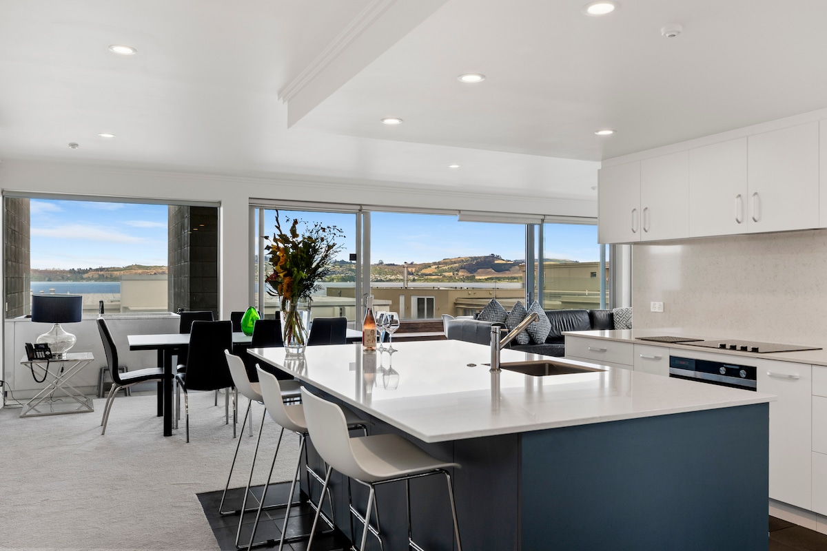 Þessi nútímalega íbúð var byggð árið 2017/18 og er heimili þitt að heiman. Stofa og borðstofa með upphækkuðu útsýni til norðurs liggja út á stóra og skjólsæla verönd. Þrjú ríkmannleg svefnherbergi með nýjum queen-rúmum tryggja þægilegan nætursvefn. Í stóra bílskúrnum innandyra er hægt að leggja bíl og bátum. Útsýni yfir Taupo-vatn, Taupo-bæjarljós og Tauhara-fjall frá stofu og verönd á efri hæðinni. Nýlega bætt við kaupauka: Fáðu þér sæti í heilsulindinni og horfðu á máninn rísa yfir Tauhara-fjalli