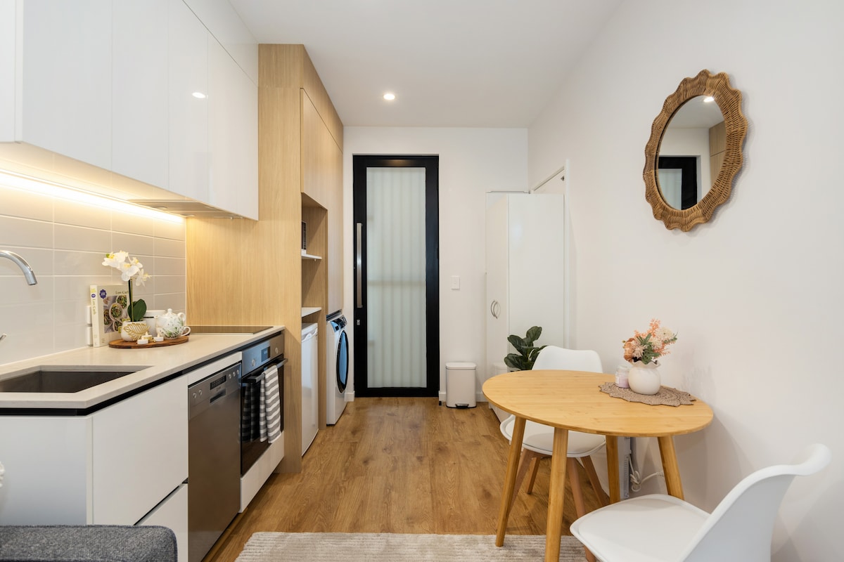 Upplifðu það besta sem Wellington hefur upp á að bjóða í þessari glæsilegu og nútímalegu íbúð með 1 rúmi. Þú verður fullkomlega staðsett/ur í hjarta borgarinnar, umkringd/ur vinsælustu börum, kaffihúsum og veitingastöðum Wellingtons. Hvort sem þú ert hér vegna viðskipta eða tómstunda býður litla en þægilega eignin okkar upp á allt sem þú þarft til að eiga eftirminnilega dvöl. Auk þess er þessi íbúð í nýbyggðri raðhúsasamstæðu sem er fullkomin ef þú óttast að sofa í steypt háhýsi í jarðskjálftanum okkar.