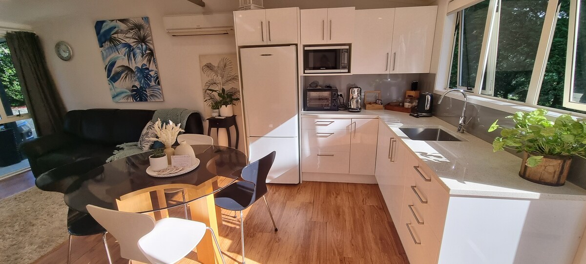 Bústaðurinn hentar pari og í setustofunni er svefnsófi fyrir þriðja gestinn. Ef þið eruð bara tvö og þið þurfið á svefnsófanum að halda biðjum við þig um að láta okkur vita við bókun. Staðsett í hjarta vínekra og brúðkaupsstaða Vestur-A Auckland, 36 km frá Auckland CBD. Nálægt er Muriwai-strönd með gannet-nýlendunni og brimbrettunum, einnig stórfenglegu Kaipara-höfninni, Woodhill- og Riverhead-skógunum. Helst staðsett fyrir þá sem ferðast í gegnum fallegu Kaipara Coast og 40-60 mín til AKL flugvallar.