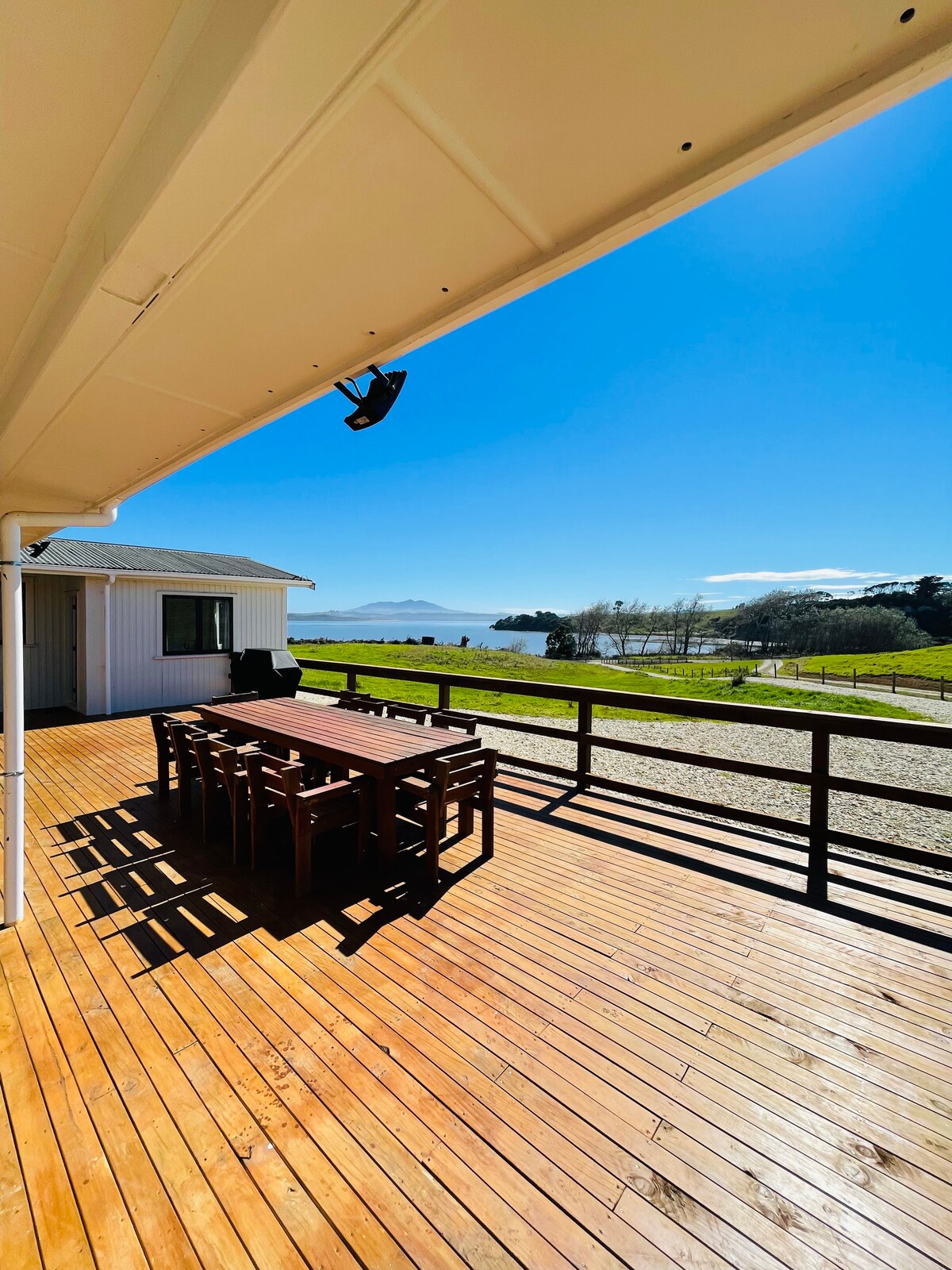 Catering to groups and families, the Shearers Quarters offers stunning views of Aotea Harbour, surrounded by lush green grass and natural beauty, you'll find it hard to leave this spot! The Shearers Quarters offers a home away from home, surrounded by breath taking sea views. Recently fully refurbished including disability shower and toilet, heat pump, ceiling & floor insulation, double glazed windows, BBQ, large entertainers decking with ramp access, fully carpeted & UV water filter system
