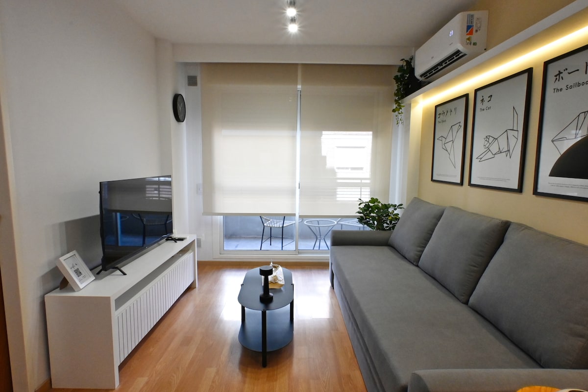 Njóttu glæsilegrar upplifunar á þessu miðsvæðis heimili. Staðsett, nálægt öllu. Það er með herbergi með hjónarúmi að framan sem gerir það mjög hljóðlátt ásamt gluggum. Fullbúið baðherbergi. Öflug loftkæling sem kælir alla íbúðina. Að búa með L hægindastól með púðum og mjög bröttum innréttingum. Fullbúið eldhús með öllu sem þú gætir þurft fyrir eldamennskuna. Sæt verönd með plöntum og þvottahúsi. Þvottahús og örbylgjuofn. Sjónvarp og þráðlaust net.