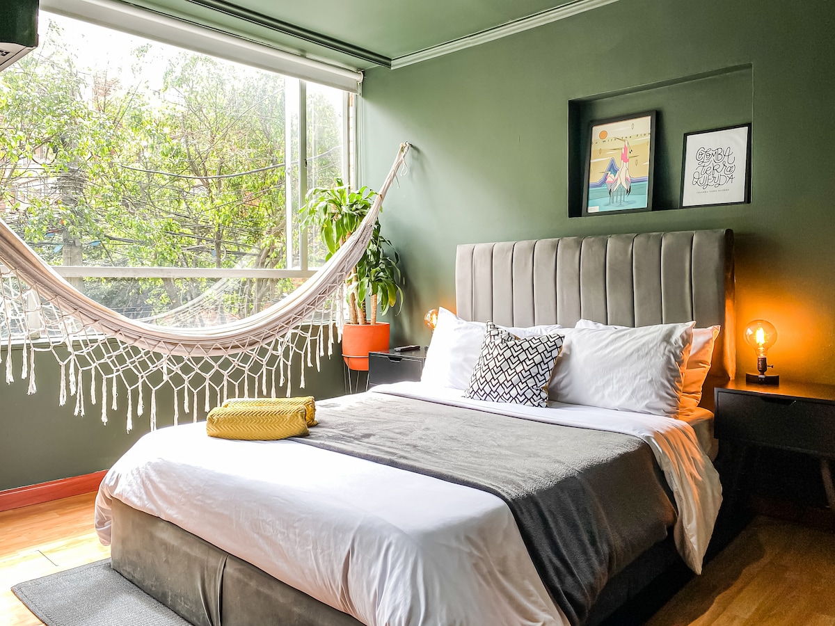 Discover this cozy botanical green studio in one of the most central, safe, and trendy areas of Chapinero—Bogotá's ultimate neighborhood for foodies and creatives. This studio features large windows, a relaxing hammock, a 32-inch TV w/ Netflix, and an efficient kitchen. Just a block away from a shared biking station, Zona G, Quinta Camacho, and Chapinero Alto. The neighborhood is 🏳️🌈 friendly