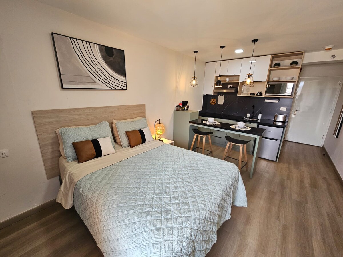 Nútímalegt stúdíó (eins manns herbergi) með frábæru útsýni yfir borgina í einni af fágætustu byggingum á svæðinu, á svæði sem er mjög verðmætt, ef þú ert að leita að öryggi, þægindum og aðgengi finnur þú það í því. Í byggingunni eru öryggisverðir allan sólarhringinn, ókeypis bílastæði og útivistarsvæði. Mikilvægt er að nefna að ef orkan slokknar er rafalverksmiðja í byggingunni.