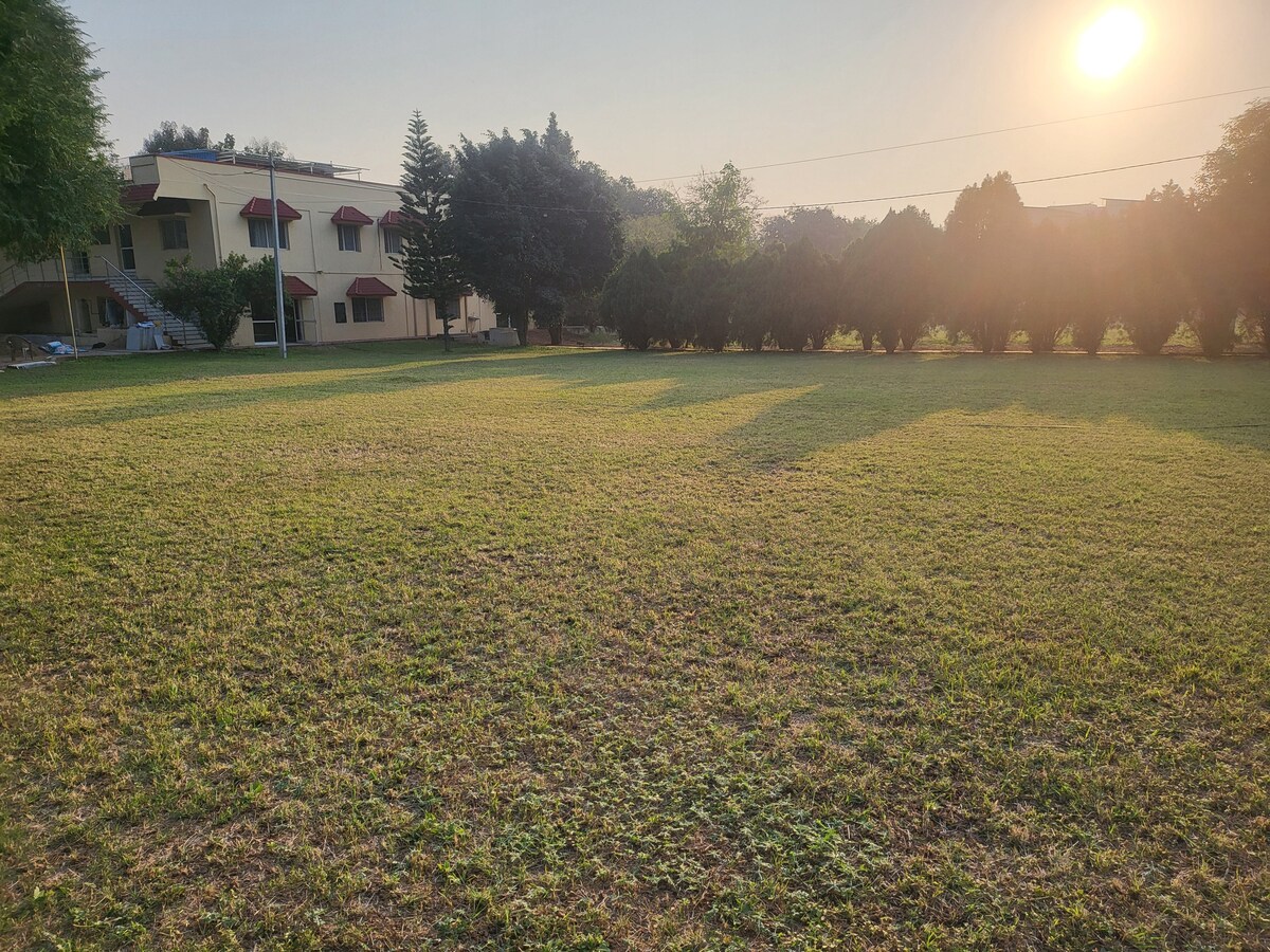 Experience a peaceful stay in this 1 BHK house—ideal for families and small groups. ✨ The Space Compact living hall with a 12" California king memory-foam floor mattress and a 2-seater recliner sofa. Functional kitchen with UV + RO Aquaguard. Master bedroom: Queen-size memory-foam mattress, large wardrobes, attached bathroom and wash basin. One separate (detached) bathroom. 6-seater dining table with wash basin. Non-AC home in winters; air cooler can be provided on request.