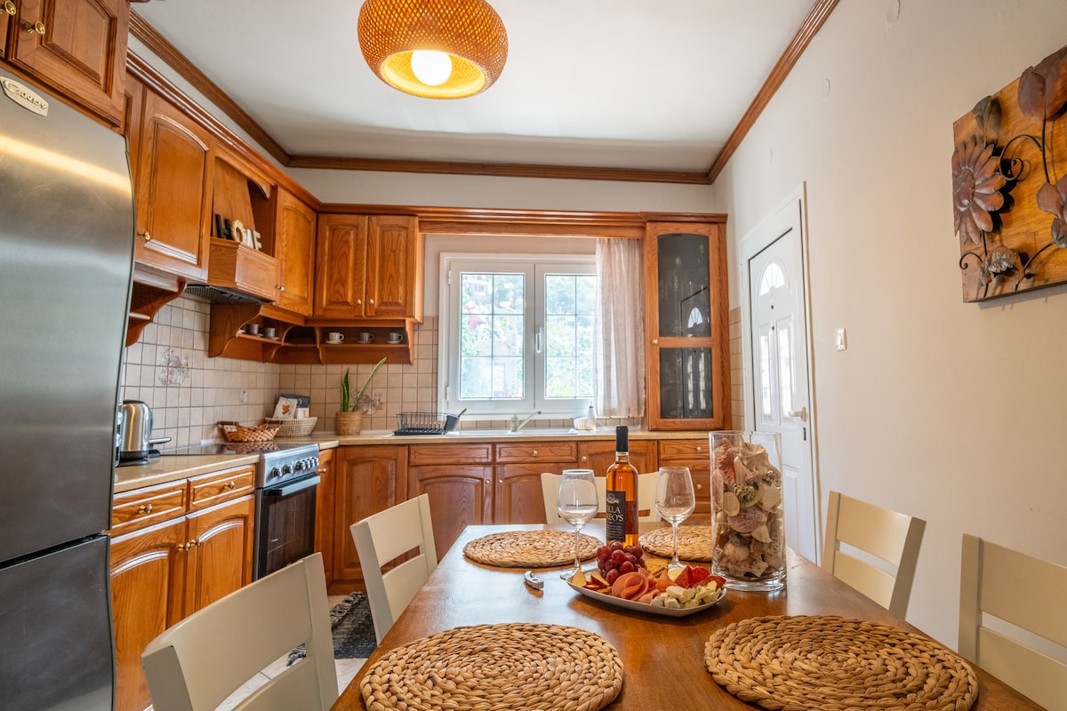Verið velkomin á friðsæla heimilið okkar✨ Staður til að slaka á, slaka á og njóta fegurðarinnar í kringum þig. Þetta er fullkominn staður til að slappa af innan um furutré og ólífulundi með mögnuðu útsýni yfir sjóinn og sólsetrið. Í aðeins 3 mínútna göngufjarlægð er komið að frægu ströndinni og líflega aðaltorginu svo að allt sem þú þarft er í nánd. Og fyrir þá sem elska ævintýri er Gerakios Yellow Path í aðeins 500 metra fjarlægð. Við hlökkum til að taka á móti þér!