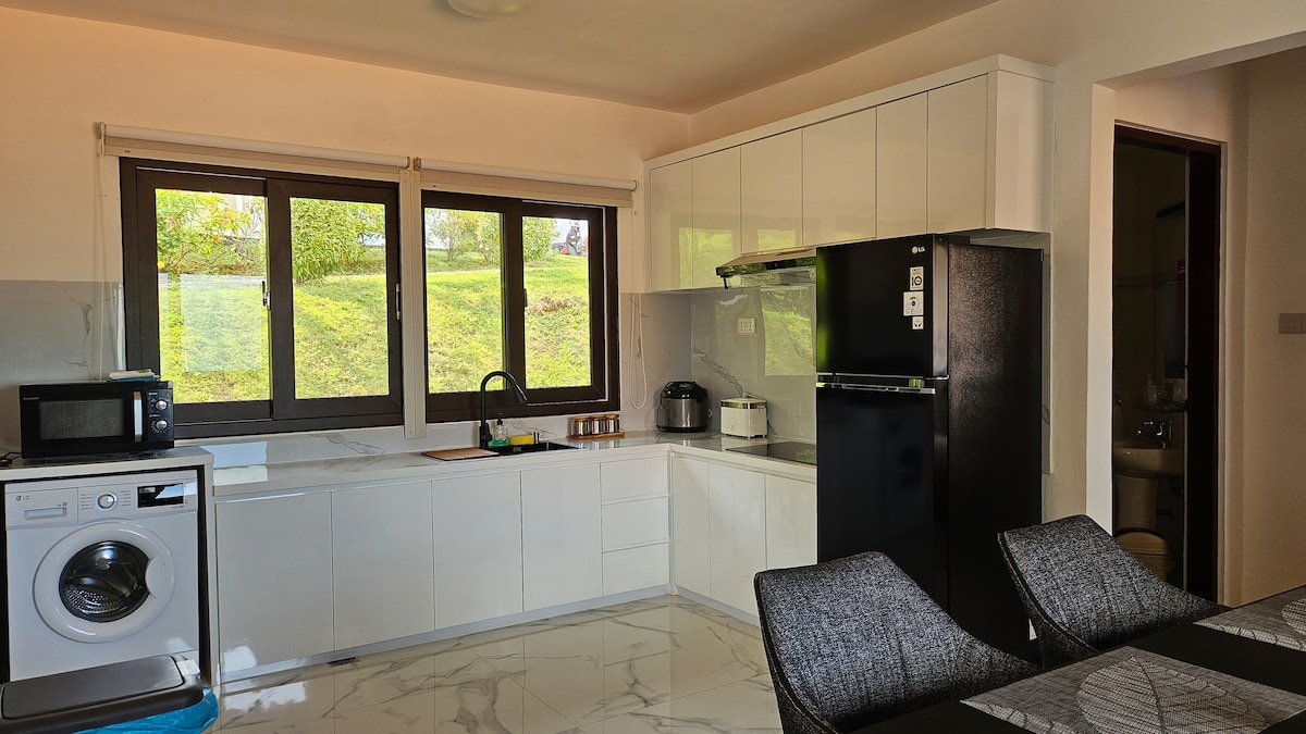 Á þessu notalega heimili eru 2 svefnherbergi, 1 svefnsófi, 1 fullbúið baðherbergi með vatnshitara, stofa með loftkælingu og sjónvarpi, góður eldhúskrókur með eldunarþægindum og borðplássi fyrir 5. Hvert herbergi samanstendur af AC, skáp, með 1 queen-size rúmi og 2 einbreiðum rúmum. Það er einnig með verönd í bakgarði og framhlið með fiskitjörn. Staðsett nálægt Food Centre, verslunarsvæði, 24 klukkustundir Clinic & Airport. Þvottavél, ísskápur og öryggishólf eru einnig í boði.
