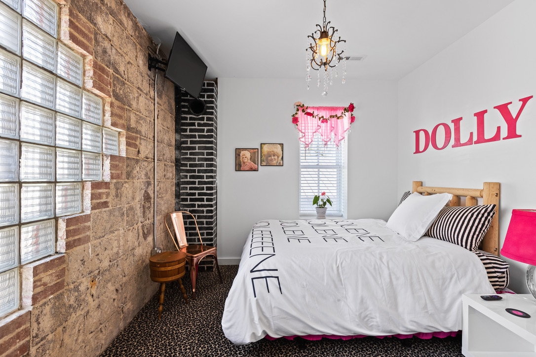 Welcome to The Silver Eagle! Named for George Jones' tour bus,The Silver Eagle is an iconic 4-suite getaway inspired by the legends of country music. A tribute to beloved Tennessee icon, Dolly Parton, The Dolly suite is all things Appalachian Glam. At The Silver Eagle, you will find uniquely designed suites, comfortable accommodations, and all of the creature comforts of home. The Dolly is equipped with a TV, Wi-Fi, a Keurig, mini-fridge and toiletries. It has a queen size bed with an en suite bathroom. There is a laundry room shared by the 4 suites. SqFt: 220