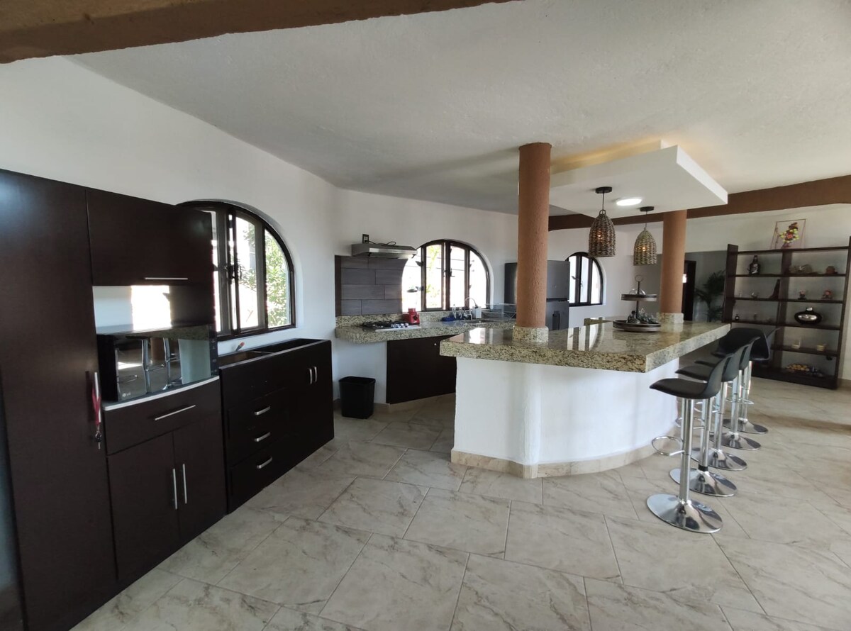 Fallegt tveggja hæða hús á frábærum hæð á lóðinni sem býður upp á óviðjafnanlegt útsýni yfir Tequesquitengo-vatn í gegnum stóru gluggana. Fjögurra bíla bílskúr. Hús með upphitaðri sundlaug, umkringt görðum, grillsvæði og búið Bluetooth-hátalara. Sjónvarp með Sky og Netflix, sem og þráðlaust net hvar sem er. Við stöðuvötnin, beint hjá okkur og næstum beint á móti, er strandklúbbur þar sem hægt er að leigja vatnaíþróttabúnað. Jardines de México, í 10 mínútna fjarlægð.