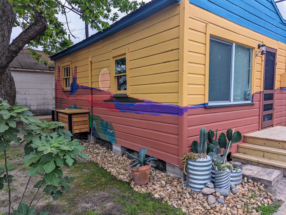 Þetta ríka smáhýsi hefur verið gert upp fyrir DIY-þáttaröðina „Restoring Galveston“. Hún er flutt frá upprunalegum stað til núverandi hvíldarstaðar og er fullkomin fjarlægð milli miðbæjarins og strandarinnar. Heimilið rúmar 5 manns með 2 svefnherbergjum og fullbúnu baðherbergi. Aðalsvefnherbergi er einnig með beinan aðgang að baðherberginu til að fá næði. Fullbúið eldhús gerir eldamennskuna í fríinu gola. Uppsetning á kaffi með Kcups, rjóma og mörgum sætuefnum. Úti að slaka á á veröndinni eða á neðri hæðinni!