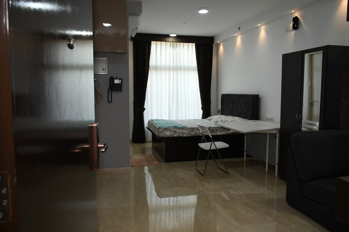 Verið velkomin í stúdíó okkar með New York á Hiranandani Estate, Thane-bringing city vibes og glæsilega hönnun fyrir dvöl þína. Vertu með mjúkt rúm, svefnsófa, snjallsjónvarp, þráðlaust net, fullbúið eldhús, þvottavél og dagleg þrif. Salerni, gufuþvegin handklæði og öryggisgæsla er innifalin allan sólarhringinn. Aðeins steinsnar frá kaffihúsum, veitingastöðum og „göngunni“. Fullkomið fyrir vinnuferðir, meðferðir eða borgarferð.