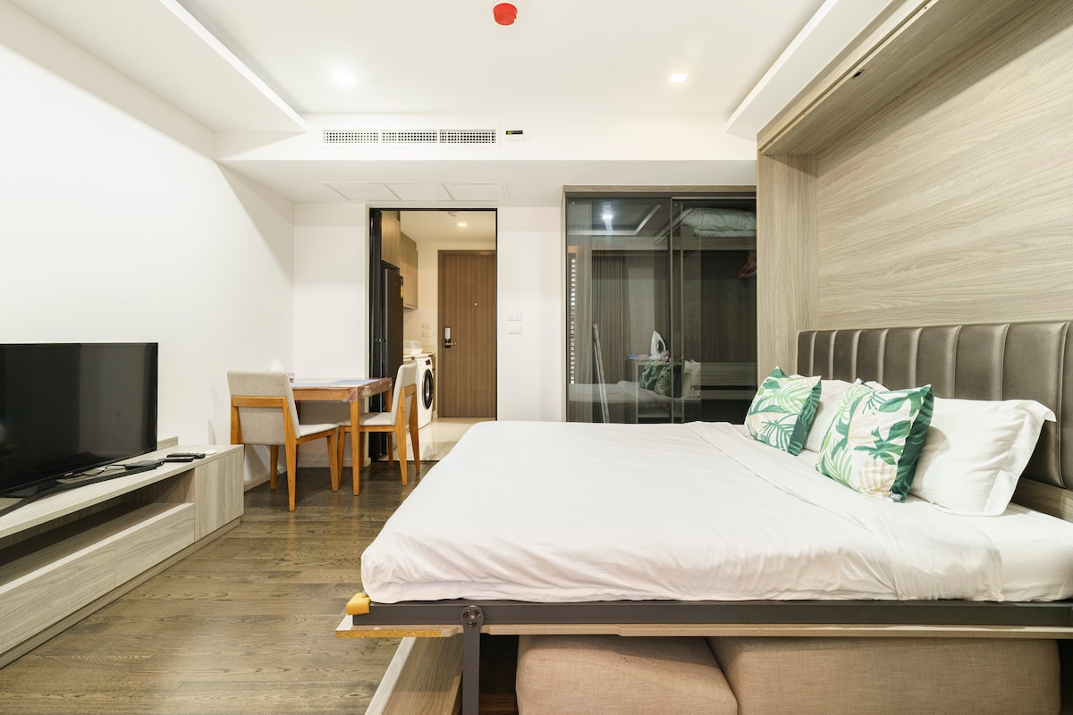 Áminning: Takk fyrir að skoða skráninguna okkar!Íbúðin okkar varð ekki fyrir áhrifum eftir jarðskjálfta og gæti lifað í friði. Hafðu samband við mig til að fá langtímaútleigu!! Aðalatriði ✔✔ eignarinnar✔✔ -RF top floor casual bar with 360 degree view over Bangkok city (H1/H2 elevator reachable) - Umsjón með hótelþjónustu, öryggisgæsla allan sólarhringinn - Ítalskur veitingastaður á 1. hæð, sundlaug, M-hæð (líkamsrækt, sameiginlegt eldhús, opinber skrifstofa) (L1/H1/H2 lyftur sem hægt er að ná í) - Létt loftíbúð í lúxusstíl, hlýleg loftíbúð - Háhraða þráðlaust net (200Mbps) - Quality King Size Double Bed (2.2m Double Bed) - Fullbúin eldhúsáhöldum og -áhöldum - Sjónvarp, ísskápur, þvottavél, loftkæling * 2 ✔✔Samgöngur✔✔ - Ókeypis bílastæði - Nálægt On Nut BTS (E9) - Tvær stoppistöðvar til BTS Ekkamai, Car East Station, beint til Pattaya - Fjórar stöðvar til BTS Phrom Phong og hanga í kringum Emporium, EmQuartier, Emsphere - 20 mínútur að komast til Siam Center BTS Siam Í kringum✔✔ íbúðina✔✔ - Beygðu til vinstri á 711 á móti Lawson - Lotus-matvöruverslun er í nágrenninu og Century-verslunarmiðstöðin. - Það eru mjög taílenskar matvöruverslanir sem er velkomið að prófa -On Nut BTS er með nuddgötu í nágrenninu til að upplifa sérhæfða nuddþjónustu á staðnum.