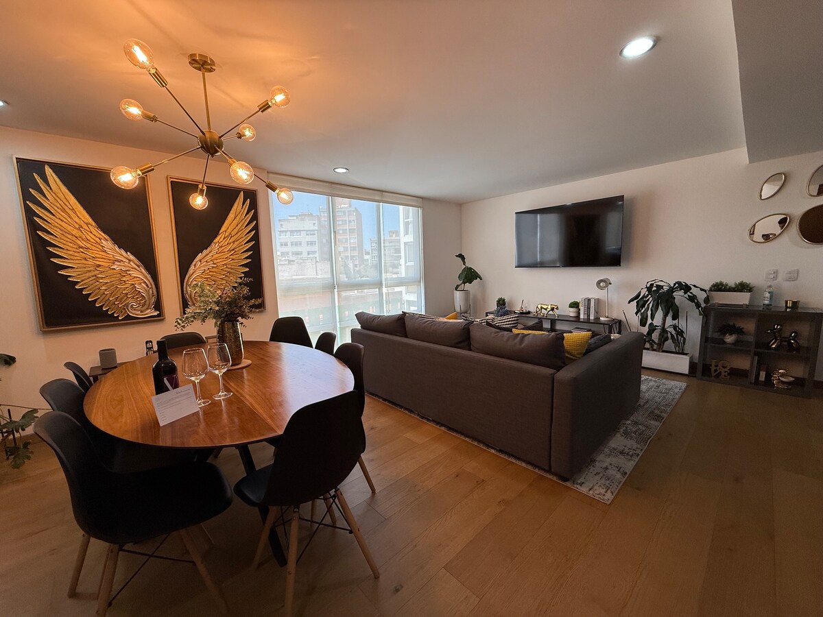 Sökktu þér í lúxusinn í íbúðinni okkar við aðalgötuna CDMX. Eignin okkar er tilvalinn staður til að skoða líflega orku borgarinnar með glæsilegu útsýni, glæsilegum innréttingum og nútímaþægindum. Hvort sem það er vegna vinnu eða tómstunda er góð staðsetning okkar auðvelt að nálgast þekkta staði og nýtískulega veitingastaði. Lifðu einstaka CDMX upplifun með okkur þar sem lúxus og þægindi eru staðsett í hjarta stórborgarinnar.