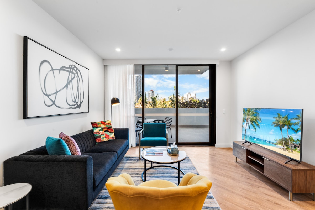 Íbúð við ströndina á háum hæð með veggjum frá gólfi til lofts, einkasvölum með útsýni yfir hafið og aðgangi að Surfers Paradise-ströndinni beint yfir veginn. Íbúðin er með king-rúm í svefnherberginu og tvöfaldan svefnsófa í setustofunni. Fullbúið eldhús, þráðlaust net með miklum hraða, loftkæling, sjónvörp með Netflix og YouTube, ókeypis bílastæði og fullbúið einkaþvottahús. Gestir hafa aðgang að ræktarstöðinni, heilsulindinni, gufubaðinu, sundlauginni og grillgrillum nálægt sundlauginni og á þakveröndinni.